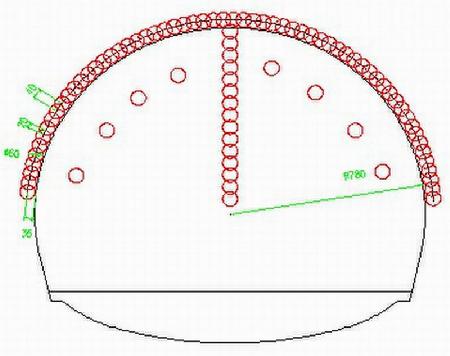 水平旋噴樁布置在隧道斷面180度范圍內,單樁長度20,樁徑600mm,樁間距為400mm,相鄰樁相互咬合200mm,每循環搭接5 m。施工采用新開發的水平旋噴臺車及雙膠管通道旋噴鉆具,一個往復行程成樁20,無需進行鉆桿拆卸,大大提高了施工工效。左右線兩部臺車四臺鉆機交替作業有效的保證了張承高速控制性工程的施工進度。